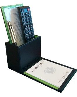 ホテルのゲストルームのTVのコントローラーのホールダーと革メモ帳